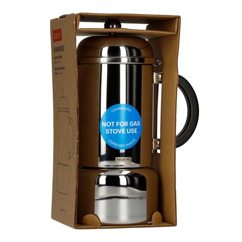 Bodum Chambord Classic stainless steel moka pot for induction and electric hobs. A simple way to brew a perfect cup of coffee at home! The Chambord espresso stove top coffee maker has traditional looks and it is made of high-quality stainless steel.