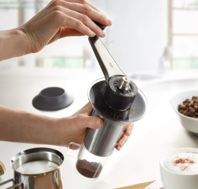 The detachable crank can be attached vertically to the holder on the side of the coffee container. In this way the coffee grinder, which is equipped with an aroma lid, takes up only little space. The tall design ensures that you get a good grip of the grinder while grinding the beans.