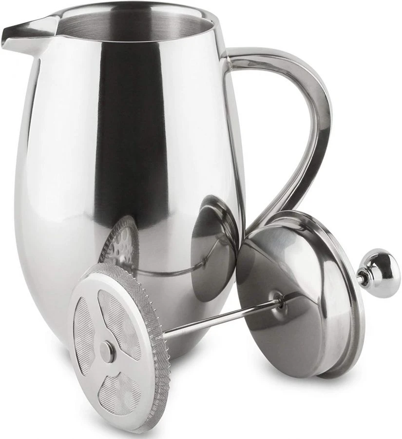 This stainless steel french press from Grunwerg has a double wall insulated structure that keeps the coffee hot for a longer time. The stainless steel body is also a more durable alternative to glass french press coffee makers. Three different sizes available: 350 ml, 800 ml and 1 liter.