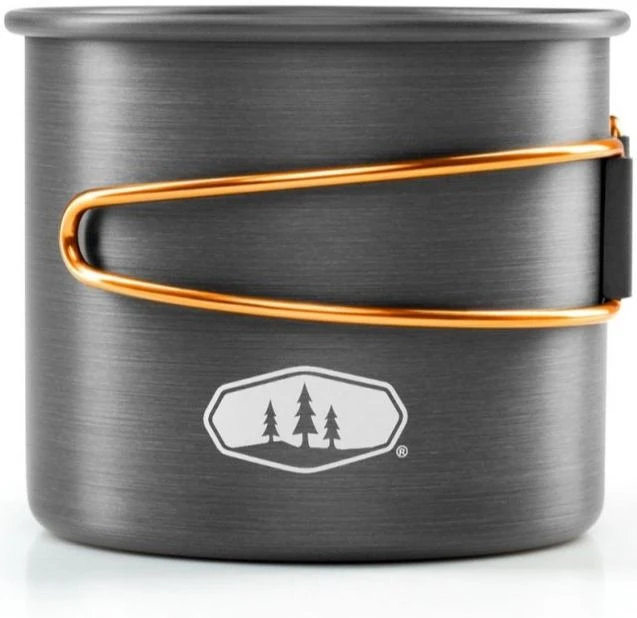 The lightweight, rugged hard anodized aluminum GSI Outdoors Halulite Cup is designed to fit over a standard 1 Liter water bottle with folding bail handles for compact storage.
