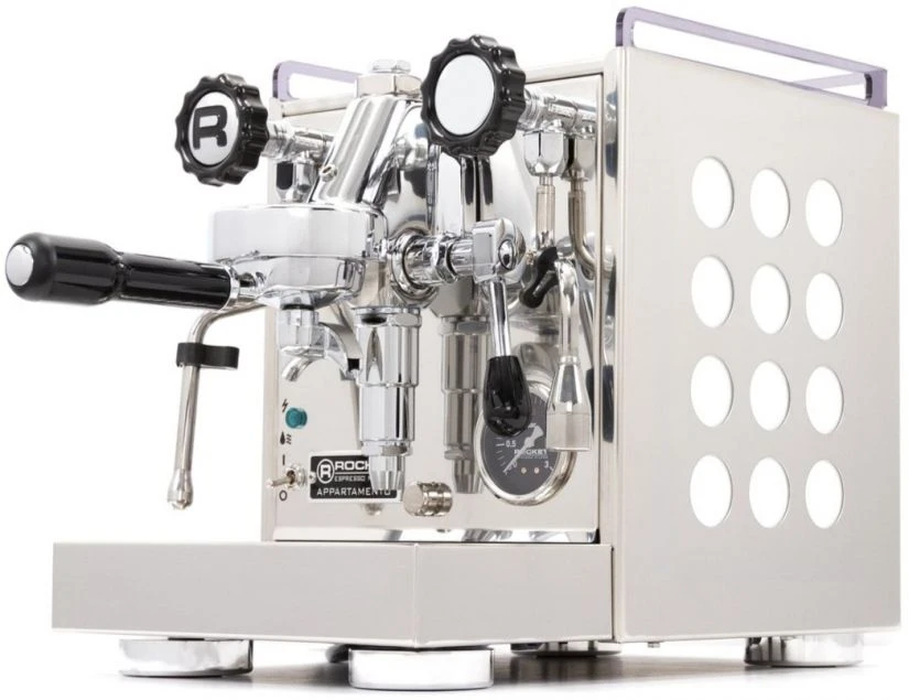 The Rocket Espresso Appartamento is a heat exchanger espresso machine with an E61 group head and a vibratory pump that runs on an internal reservoir. Powerful steaming pressure, a large reservoir, and cutout panels help the Appartamento stand out as stylish and efficient.