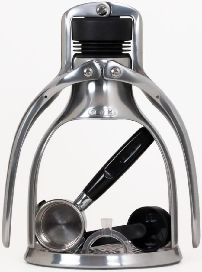 The ROK EspressoGC manual espresso maker is crafted from cast aluminium, steel and glass-composite.